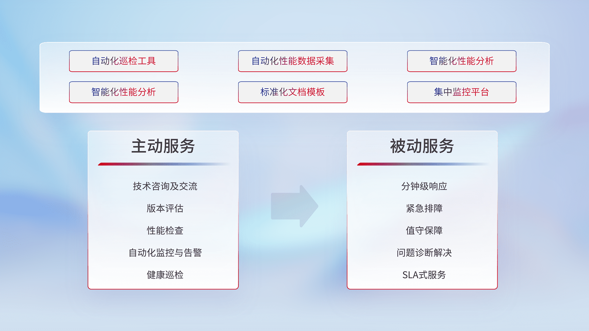 智能化工具和标准化文档,,,,保障服务质量,,提供主动服务(包含技术咨询、、、版本评估、、、、性能检查、、、自动化监控与告警、、、、健康巡检)和被动服务包含(分钟级响应、、紧急排障、、、值守保障、、问题诊断解决、、SLA服务)。。。。