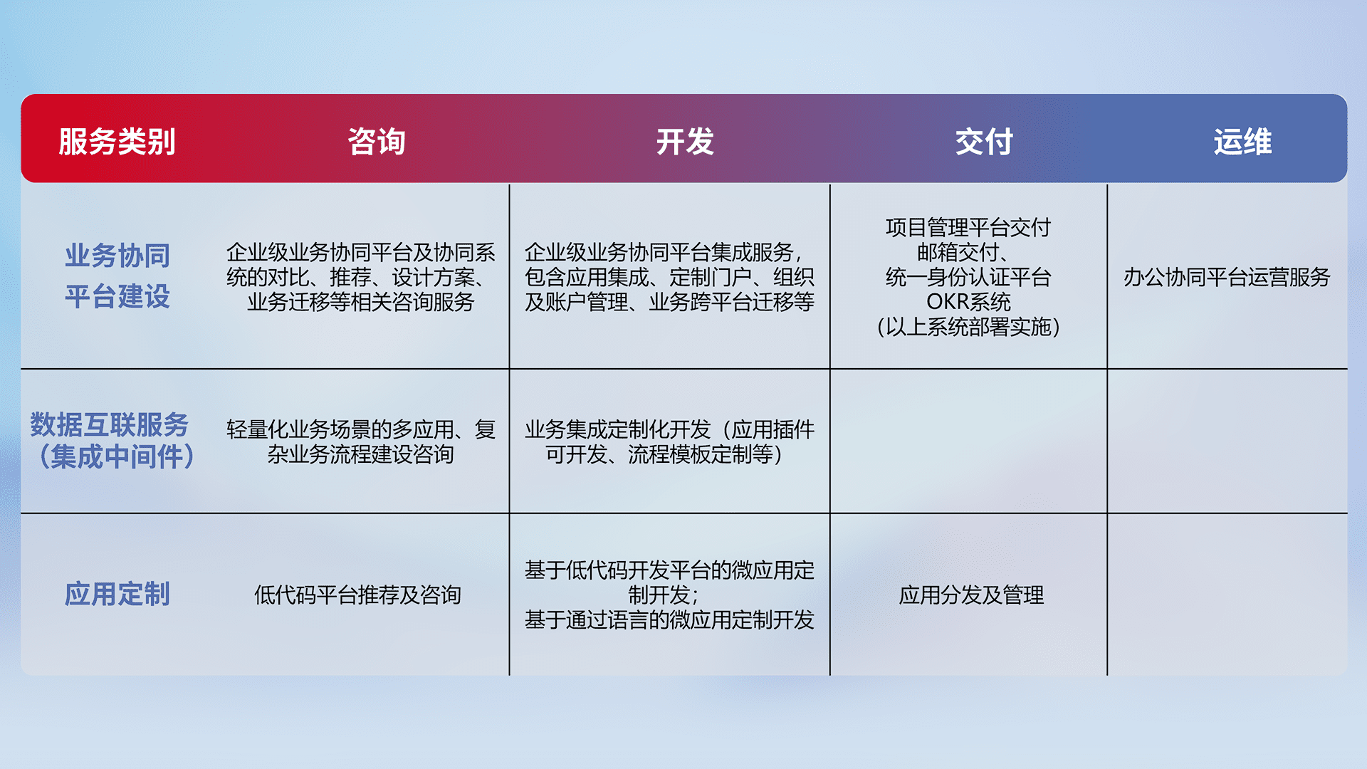 针对钉钉、、、企微、、、IDaas等平台级产品提供产品的规划、、、方案、、、交付、、、定制化开发等服务,,,实现如统一协同办公、、智能客户服务、、、混合会议管理、、、智能数据查询、、、、等业务场景,,,实现数字化转型。。。。